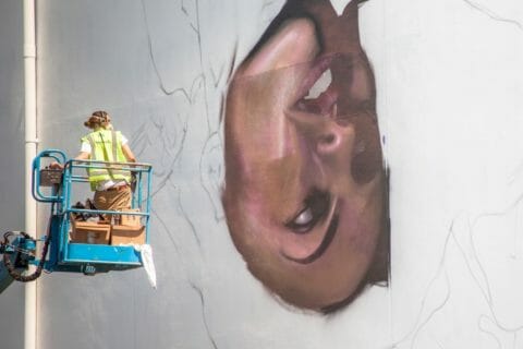 For SODO Track, Drew painted a figure of traditional beauty unconventionally upside down. She gazes and extends a hand towards Joram Rouke’s subject to the south, while carrying with her CYRCLE’s neighboring message of struggle and hope.