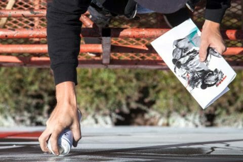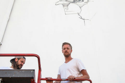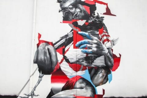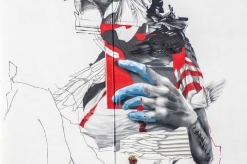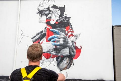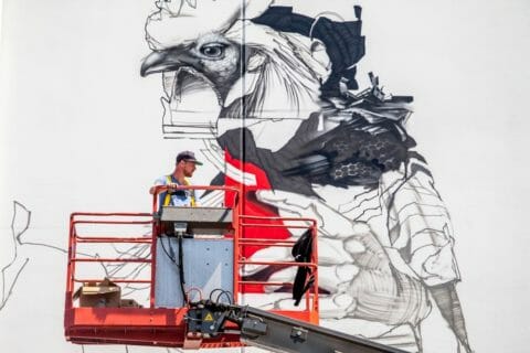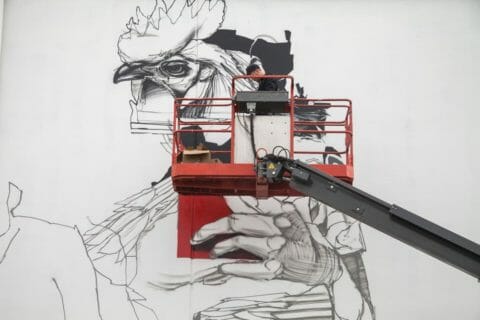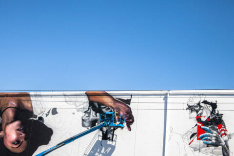 Dutch artist Joram Roukes often explores the lines between growth and destruction, beauty and decay. His collage style painting layers realistic representational forms with abstract forms of color. Known primarily as an oil painter, his mural for SODO Track offers a rare publicly accessible glimpse into the artist’s examination of contemporary existence.