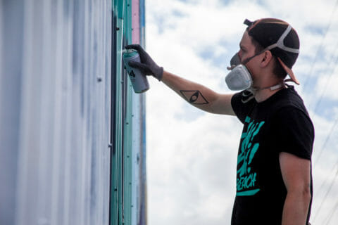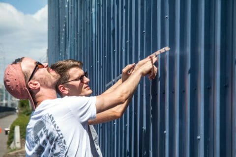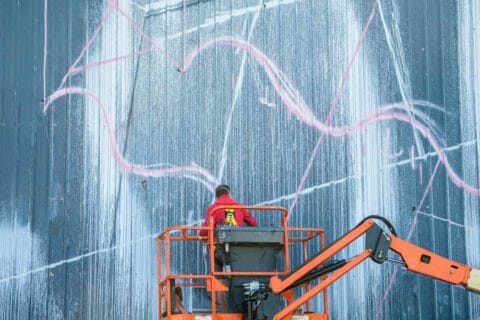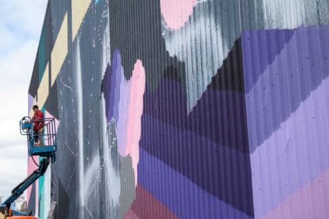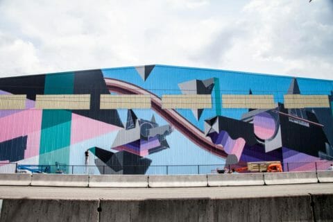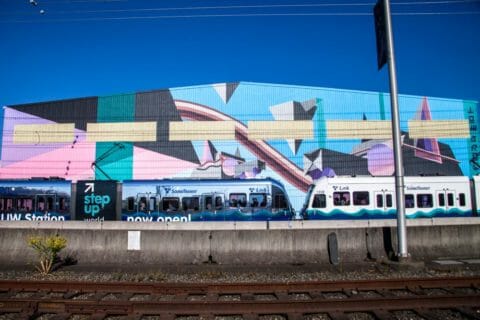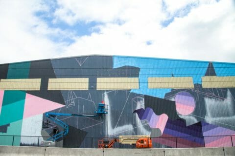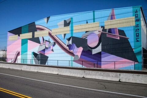 Uniquely qualified to paint nearly 7,000 square feet of corrugated metal on the SODO Track, the Low Bros’ bold and graphic approach obscures the uneven surface with a composition ingeniously created entirely of large color shapes.
