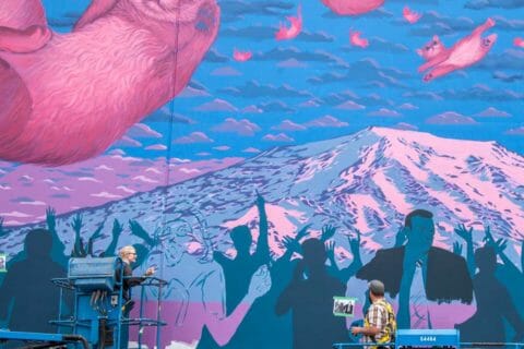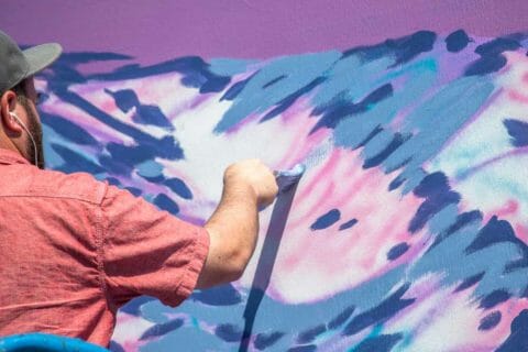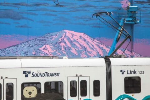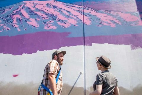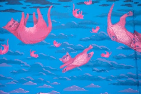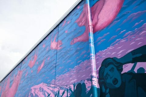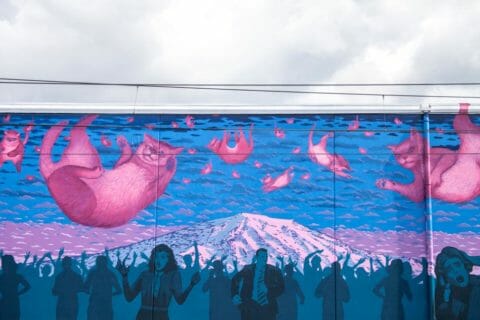 In an impressive mural debut, for SODO Track, Casey and Syd created the lovable, cinematic When it Rains it Purrs. Set against the backdrop of a Mount Rainier sunset, the crowds of people run in panic as glowing cats rain down from the sky. Loosely based on Alfred Hitchcock’s The Birds, the artwork offers a play on the phrase “raining cats and dogs” and a nod to the Seattle weather.